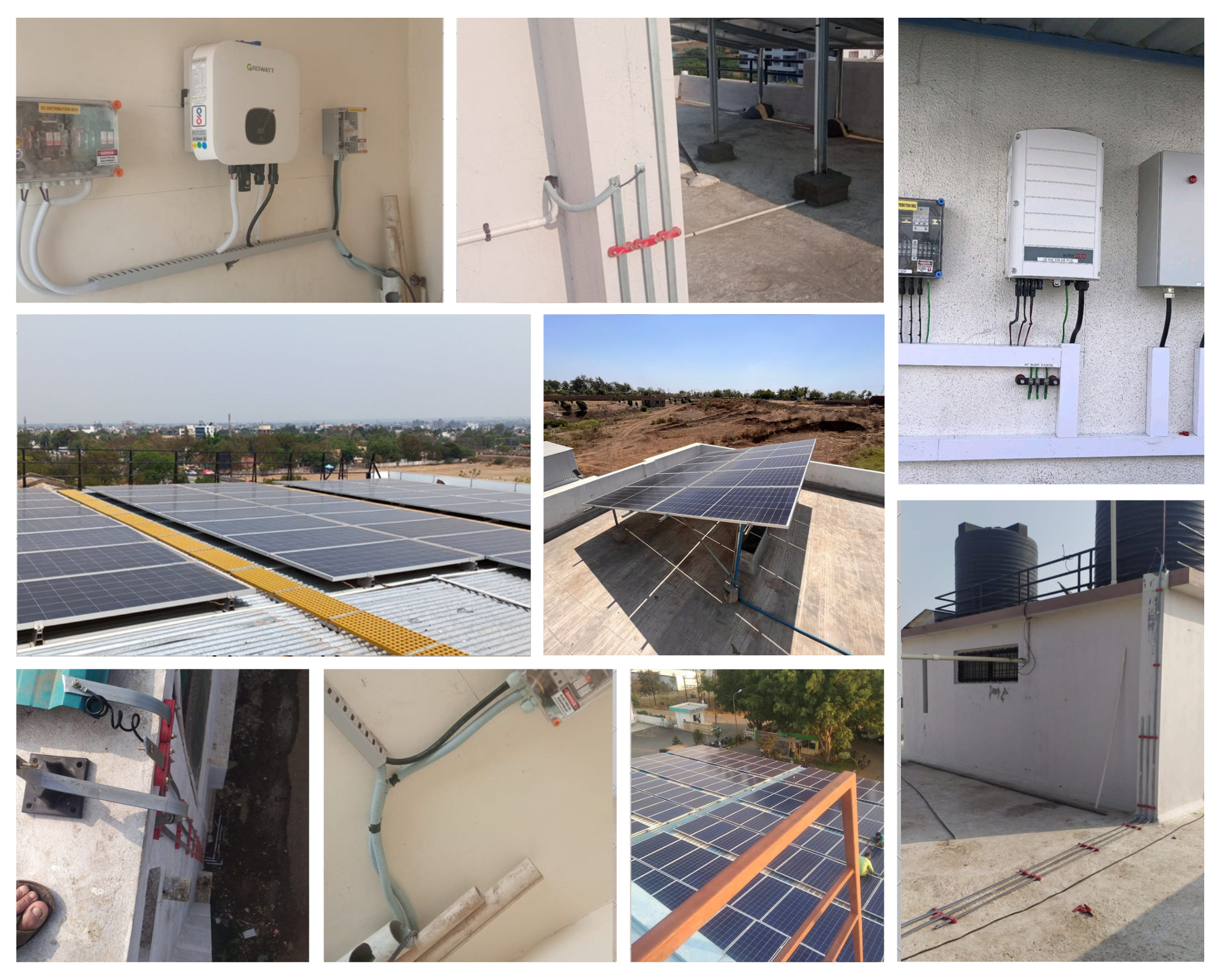 Solar panels generate electricity, converted from DC to AC power by a grid-tie inverter, which is then used on-site.